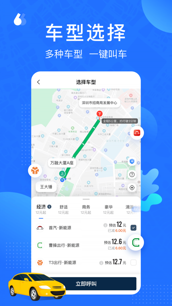 1、随叫随到,一键打车,快速响应,车型选择,多种车型,一键叫车,安全中心;