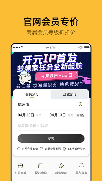 2、酒店预订按目的地城市搜索酒店列表,按会员级别显示房间类型和房间价格明细,开启“最大房间预订优惠120元”活动,满足会员需求