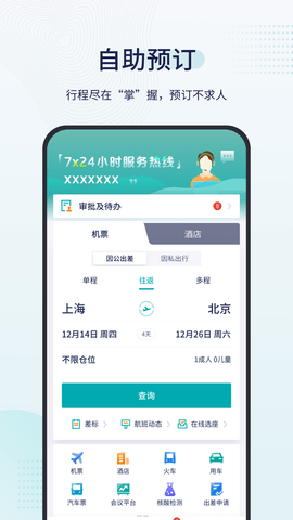 3、随时随地提供国内外机票网上预订、国内外酒店、火车票、公务租车、机票预订、企业奖励等服务