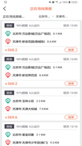 4、一键式拼车;还原出租车线下场景,乘客更优惠,司机更高效服务。