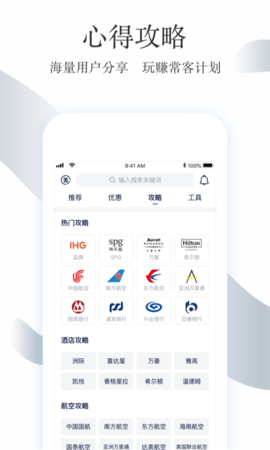 旅行指南,如里程累积和兑换技巧、会员升级和促销、积分兑换和兑换、信用卡刷卡技巧和方法、频繁的客户共享、酒店航空公司促销和折扣信息,可以随时随地查询,并且可以通过一键发布和共享。