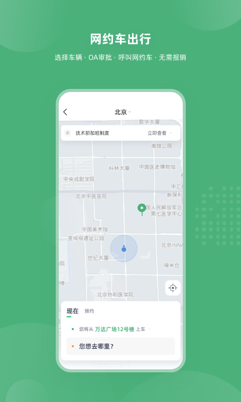 3、网约车出行:选择车辆,OA审批,呼叫网约车,无需报销;