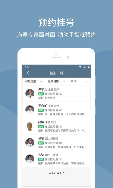 1.八大处整形医院app可根据时间段、科室、专家在手机上自由进行预约挂号。