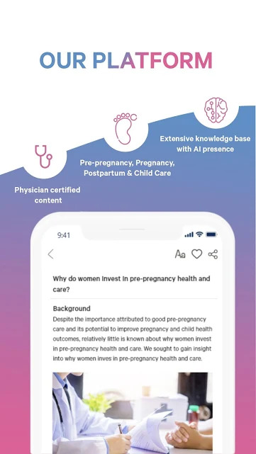 1、怀孕前 - 我们的应用程序建议有抱负的母亲提供最佳实践,以增加成功怀孕的机会。这还包括有关体外受精(IVF)的信息,避孕指南以及与您所爱的人联系的提示。