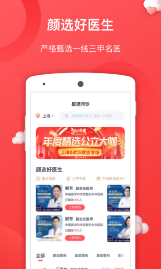 颜医app手机版严选各大知名整形医院以及行业医生,为用户提供优质的美容整形服务,方便广大用户在线更好了解当前的各种医美项目咨询以及分享各种整容经验以及整形后效果,给其他用户用来参考,还能随时在线咨询医生,咨询整形疑惑,还能随时在线预约专业门诊,让你整形更安心,爱美的小姐妹就来下载体验吧!