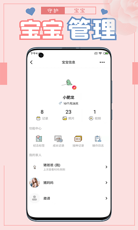 2、一键邀请家人,全家人共同维护宝宝成长档案,分享宝宝成长记录,实时了解宝宝成长状况;