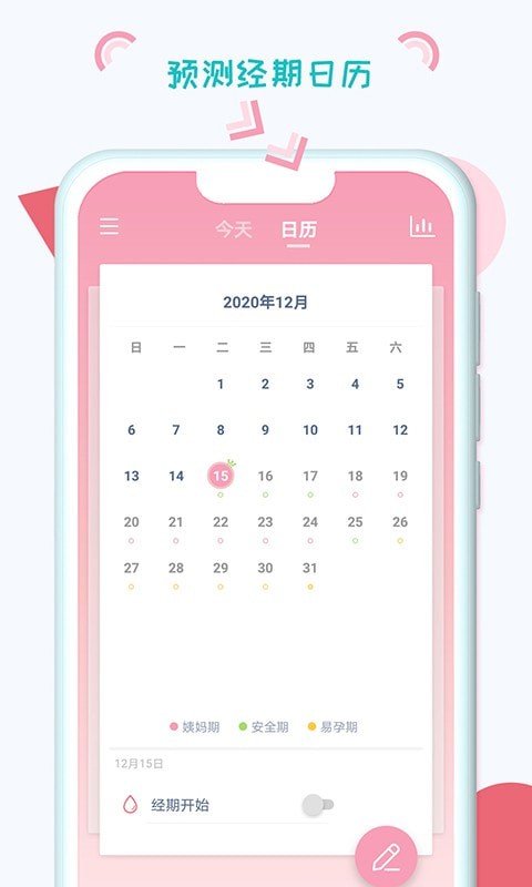 2、每月都会通过彩色日历标记显示的周期预测,使您可以直观地浏览姨妈的月经趋势