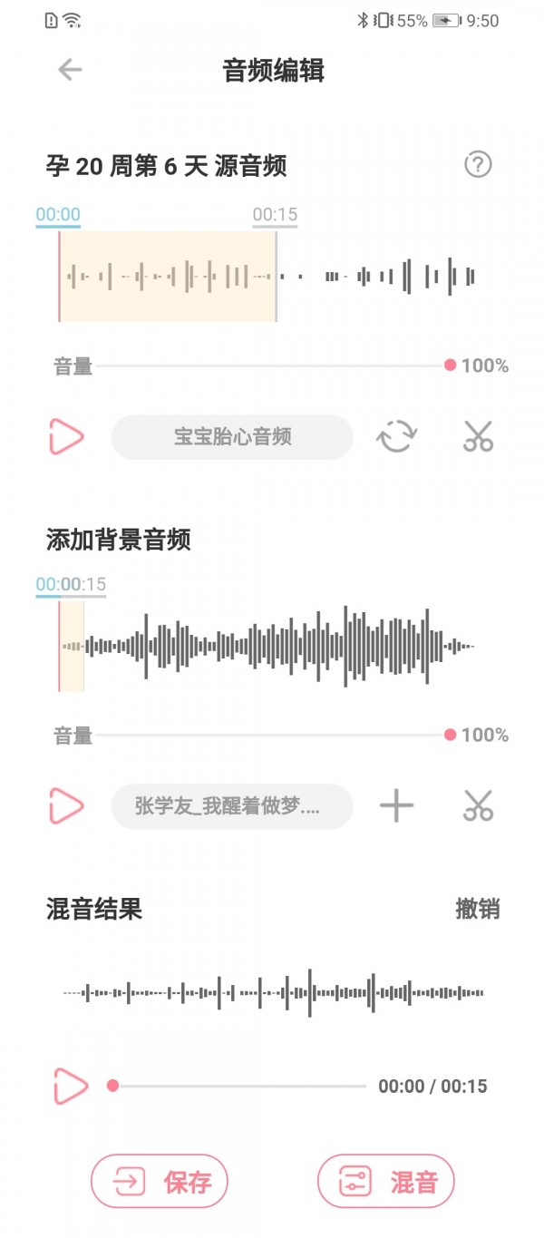 2、录制的胎心音可剪辑、混音,合成一段美好的音律还能一键分享