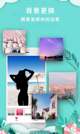 2、内置20种精美背景图库,用户还可以自行从相册上传背景进行和抠图人像的合成;