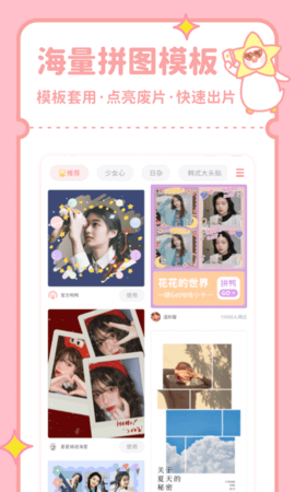 拼图鸭相机app是一款拥有多种贴纸、特效和模板的少女拍照软件,使用起来非常方便,这里不仅有设计师小姐姐精心原创设计字体,还有各种精美滤镜,让本就颜值爆表的你更加可爱,而且美少女们在拼图的过程中还会与可爱的鸭鸭进行偶遇哦!这种互动式的陪伴,让你在拼图的时候能有更好的体验。