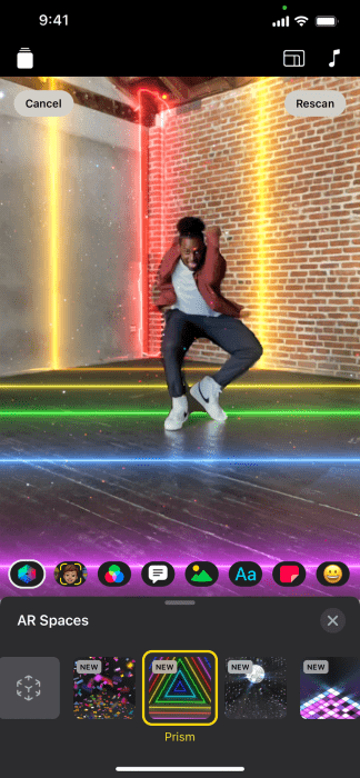 通过“ar空间”,以符合空间轮廓的身临其境、有趣的视觉效果改变您的环境。您可以将房间变成迪斯科舞厅,用有趣的对象填充房间,或添加动画灯光。录制时,效果将完全适合您的空间。