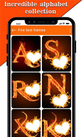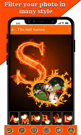 火文本相框app是一款可以处理多方面图片的软件。每个人都喜欢用自己的名字字母来创建图像。使用火文本相框制作带有热文本照片的壁纸。您可以轻松制作带有姓名字母的时尚火文本相框。使用我们的火文本相框,轻松快速地进行编辑。