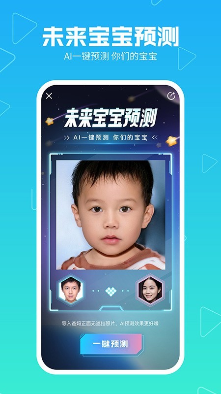 1、【未来宝宝预测】美柚相机下载安装后,AI一键预测你们的宝宝,上传2张照片即可,快来感受一下吧。