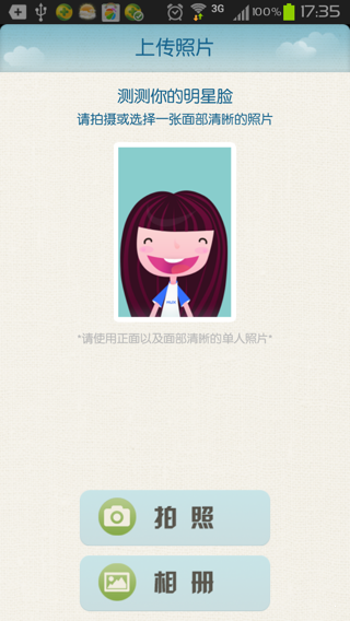 3.只需要利用手机摄像头自拍或者选择已有的照片,几秒后就可以知道自己与哪位明星最像。