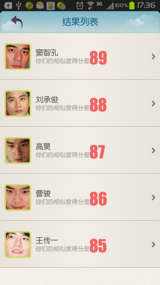 4.找到和您最相似的歌星,并可查看您的面相,加入明星排行榜。