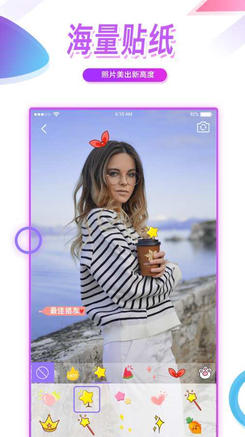 1、你可以和你的朋友在应用程序中为贴纸拍有趣的照片。超级可爱漂亮的材料可以免费使用,你可以找到不同的人。用户可以拍摄不同风格的头像。