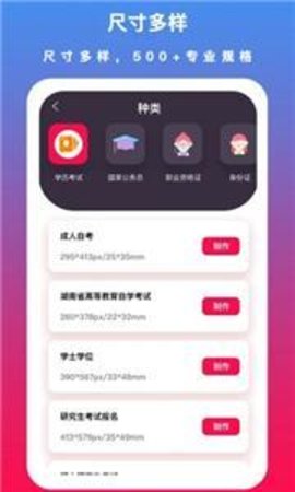 2、多种证件拍照规格:支持一寸、二寸、小一寸、小二寸、学历考试、职业资格证书、旅游签证、语言考试、IT认证、国家公务员、财务会计、建筑工程、医疗卫生、驾驶证等各类证件拍照需求现场拍摄。