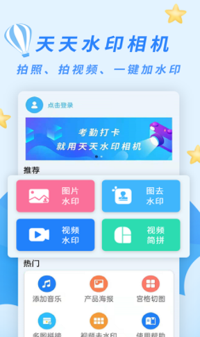 天天水印相机app是一款功能强大、适用的手机水印相机软件。有许多美丽和盛行的水印和丰厚的照片模板。支持一键添加您最喜欢的背景音乐和精细的过滤器,还具有考勤打卡功用,操作简单。