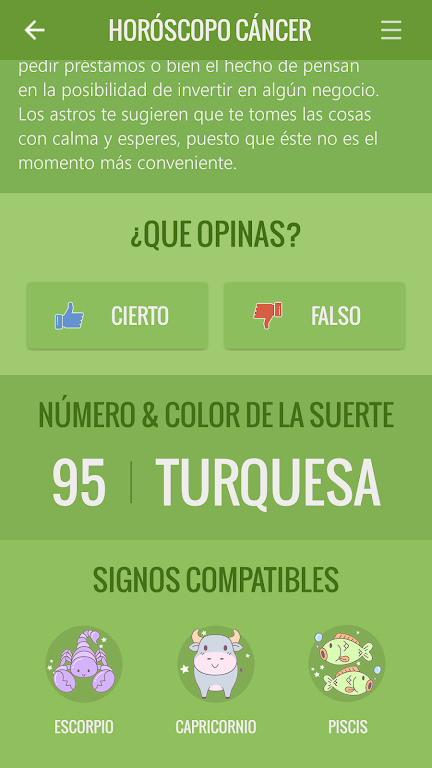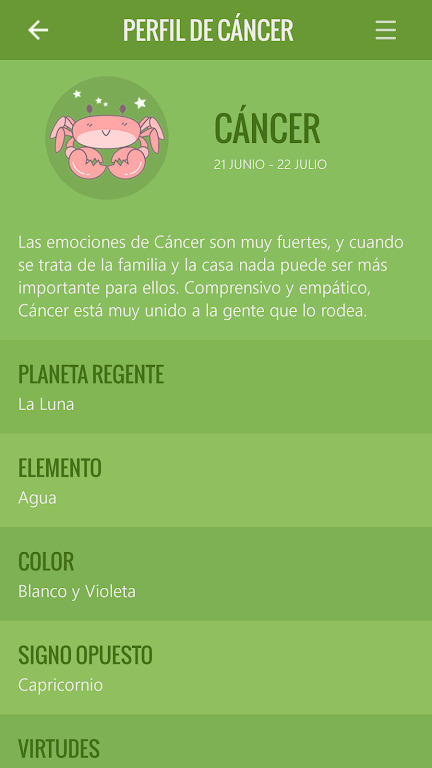 这个应用程序是完全直观的,除了有一个温和和甜蜜的设计,但仍然是正式的。100%实现你的目标:每天在你舒适的Android设备上免费提供你的巨蟹星座。