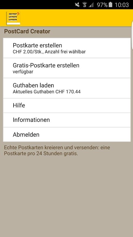 发送免费明信片后,时间限制为24小时,直到下一张免费明信片。过了这段时间您可以免费再发一张您的b信件。任何时候都可以由CHF 2领衔大量奖励。他们会被派到每件事物中。收费卡和免费明信片不同,都是免费的,而且会通过a信件发送。可以用额外空间添加更多文本。要登记你必须在瑞士或列支敦士登有一个住址。