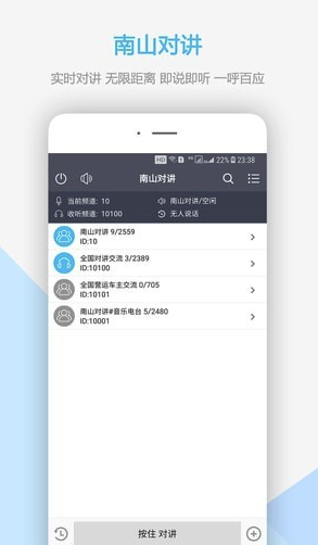 【小编推荐】:南山对讲机,一款方便好用的手机对讲软件,软件可以让手机秒变对讲机,可以实现多人同时会话,及时黑屏了也能收听到声音,只需要输入频道即可,非常的简单方便。