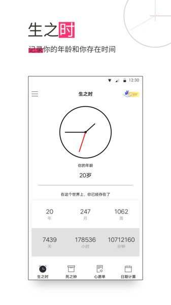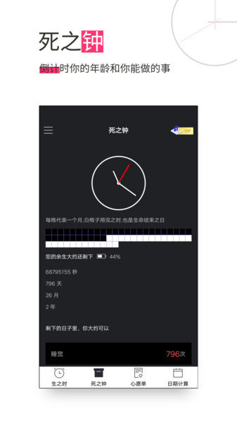 2、更有创意死之钟模式,方便用户在线查看自己寿命倒计时间。