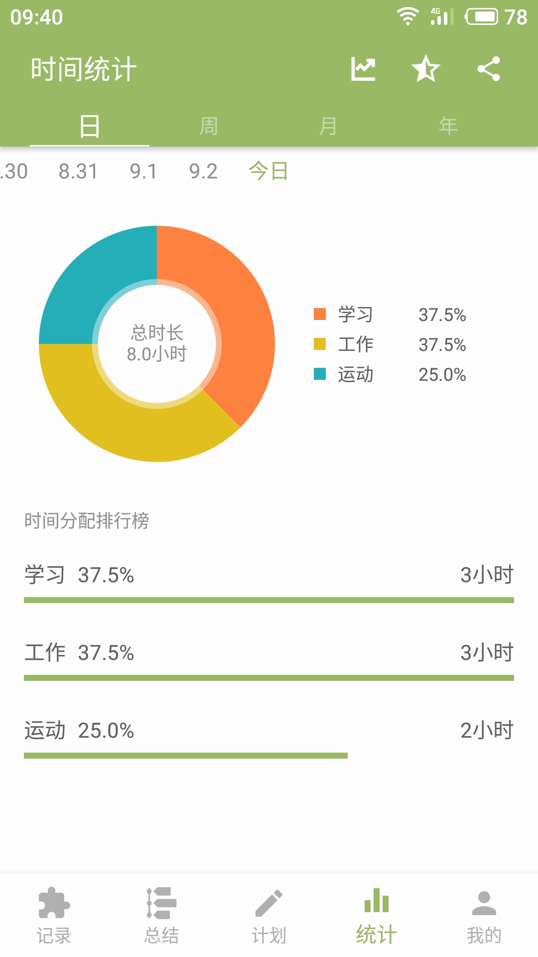 2、可查看当日时间分配为几个类别,大部分时间用在什么地方。