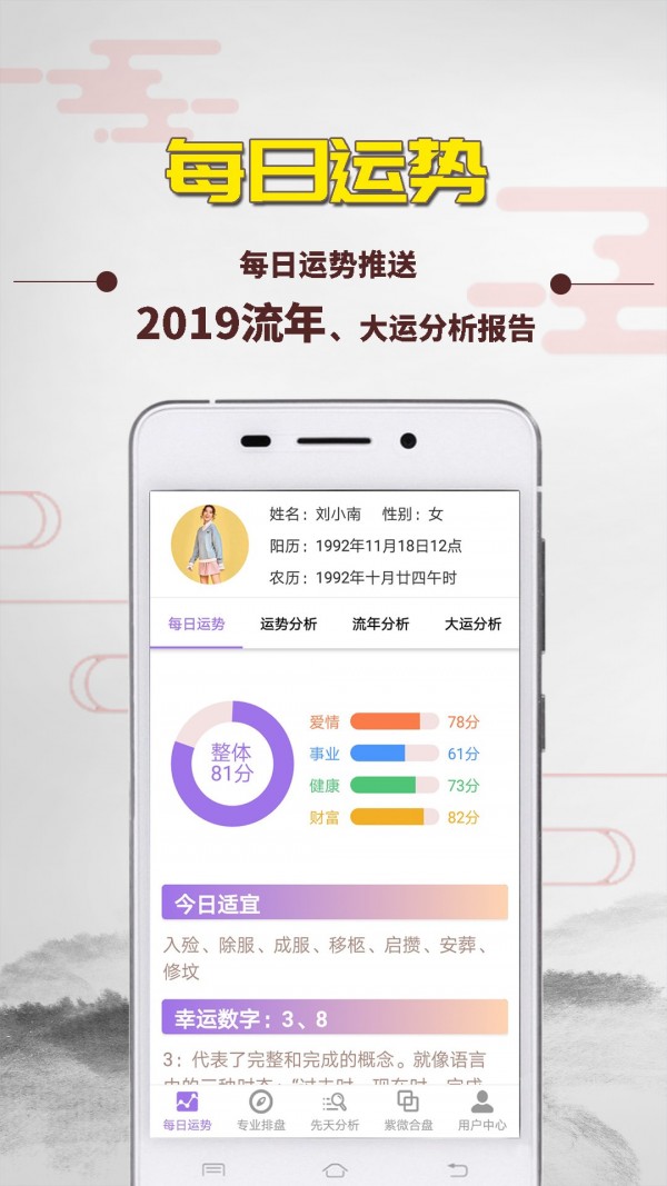 1、先天分析:从用户的紫微排盘中查看运势、感情、事业、健康等等多项详细的分析报告;