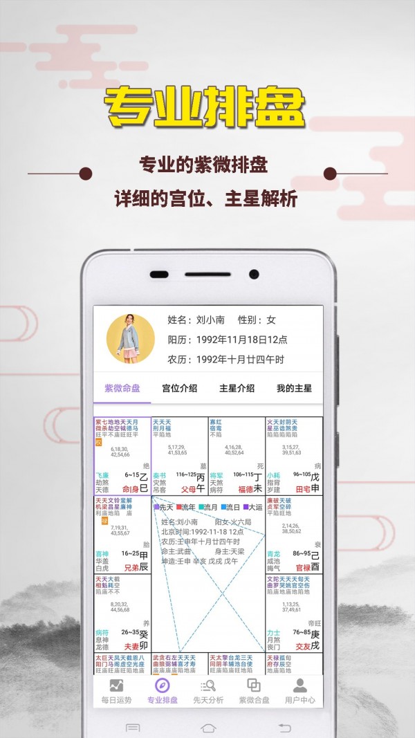 2、以天干地支阴阳五行为基础,通过对星象的分析及人星关系的定位推演紫微排盘及紫微详解;