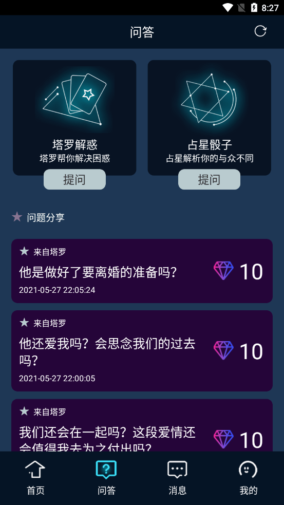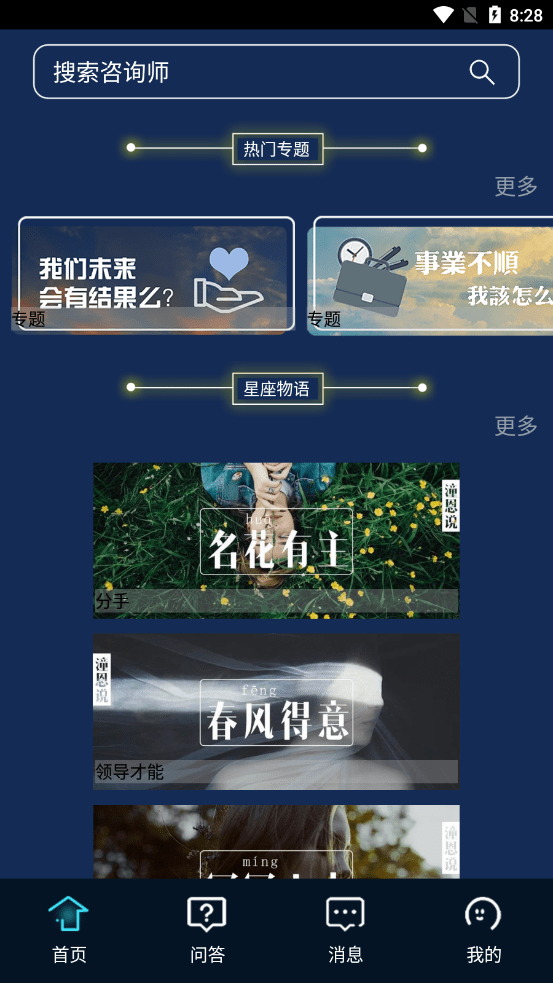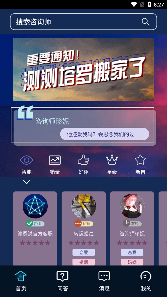 3、潼恩说app下载后提供塔罗,占星,周易等多种项目咨询,为用户提供专业建议。