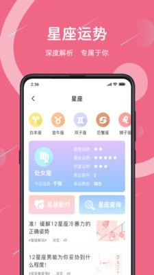 2、星座运势:根据用户的星盘来深度解析今后各方面的运势情况,且提供每日运势可供查看;