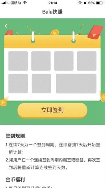 Bala快赚试玩是一款非常实在的手机赚钱软件,用户只需要在平台上试玩几款小游戏就能够获得大量的收益,Bala快赚app下载后今日收入和累计收入一目了然,用户随时都能够选择体现,并且如果玩家连续七天进行签到还能够获取金币福利。