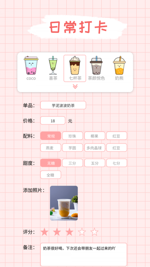 1、每日签到:今天和的奶茶是什么味道? 什么成分?有没有踩雷?这些都可以记录;