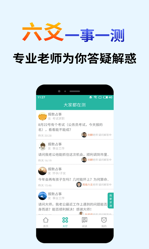 算卦占卜大师APP是一款非常专业的手机占卜软件,一般的占卜软件可能都是系统算卦为你得出结果,没办法对用户的很多疑问做出解答,但是算卦占卜大师下载后有专业的真人占卜大师为你答疑解惑,用户有再多的疑问都可以直接在线问,每一位大师都有多年的占卜经验,非常专业。