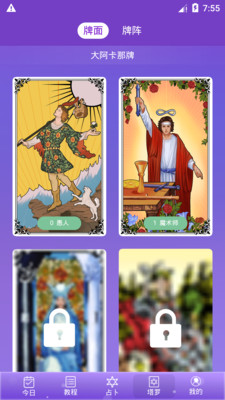 1.塔罗牌占卜软件塔罗牌共有78张卡,其中主卡22张,辅助卡56张。