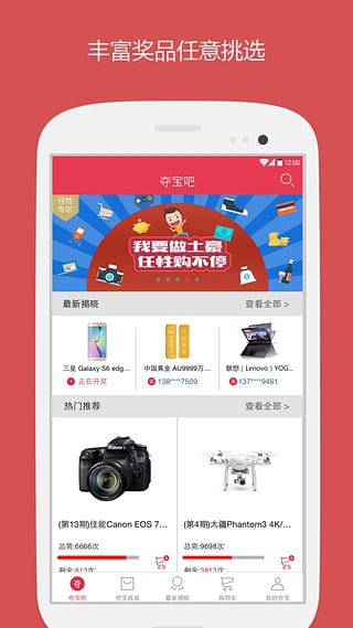 夺宝吧提供时尚一元云购物平台,1元购买全场任何商品,手机、平板、单反、时尚智能设备、零食等。通过大家的力量,实现拥有时尚商品的愿望,赶紧来夺宝吧!!!