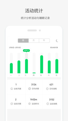 2、运动数据统计——详细的数据图表,让你了解每周和每月的运动睡眠标准,调整目标计划。