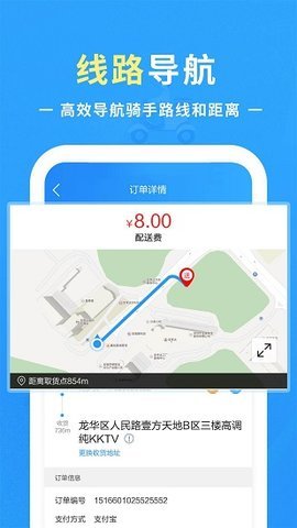 3.提供实时配送路线导航地图,显示了更清晰的路线信息和实时距离动态,增加了配送环节的透明度。