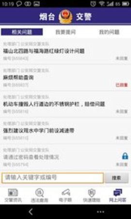网友可以在这里提交与烟台交警有关的意见和建议,查询相关信息。使网民反映问题、解决问题、寻求帮助的渠道更加便捷畅通。