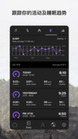 5.可查看用户近期活动与睡眠信息的趋势比较情况。在睡眠模式中日记视图会显示个人睡眠信息,帮助用户及时了解个人状况,有利于平衡活动、休息和睡眠之间的和谐。