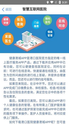 1.健康港城app服务致力于为城市居民打造一站式互联网医疗服务平台,让健康触手可及。