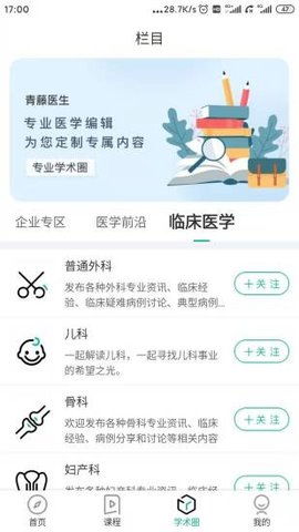 2.这里开设了专业医学课程,方便随时在线学习,通过加入这里的学术圈,用户可以与大家交流和互动。