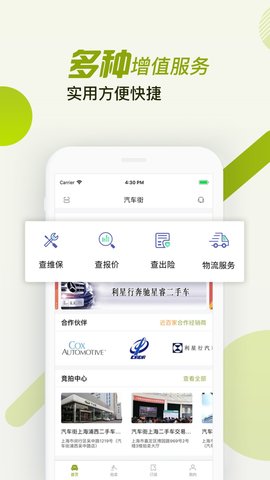 汽车街APP是一个专注于二手车拍卖的交易服务平台。由全球二手车拍卖公司考克斯汽车集团和由中国汽车流通协会、招商银行等牵头的全国百强核心经销商集团汽车交易平台共同发起和资助。