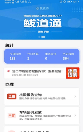 鲅道通app是鲅鱼圈政府为抗击疫情而开发的一款针对港口前方短途运输车辆的信息服务应用。政府官员通过OCR扫描司机的身份证和车牌号,自动查询核酸检测结果,并在第一时间将其显示在应用程序上。工作人员可以标记核酸异常,特别注意并跟踪它们;对于普通的车辆使用者,条形码被发布和记录,这大大减少了工作人员和司机之间的接触,极大地阻止了疫情的传播,提高了工作效率。