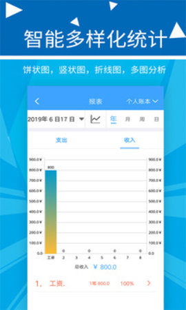 4.智能统计:折线图和饼图显示,清晰了解周、月收支构成