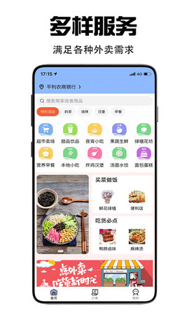 3.炸鸡汉堡,中式快餐,地方特色,粥食面点等美食随意选购。