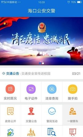 海口公安交警是海口市推出的便捷服务软件。提供多功能查询,如违章查询、违章报告、实时路况、天气查询等,服务小助手。具有公安机关、个人社保、账号登录后还可享掌上服务。