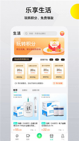 1.健康模块,包含血糖、血压、尿酸、心率和运动健康指标,为用户提供数据云存储和健康预警。