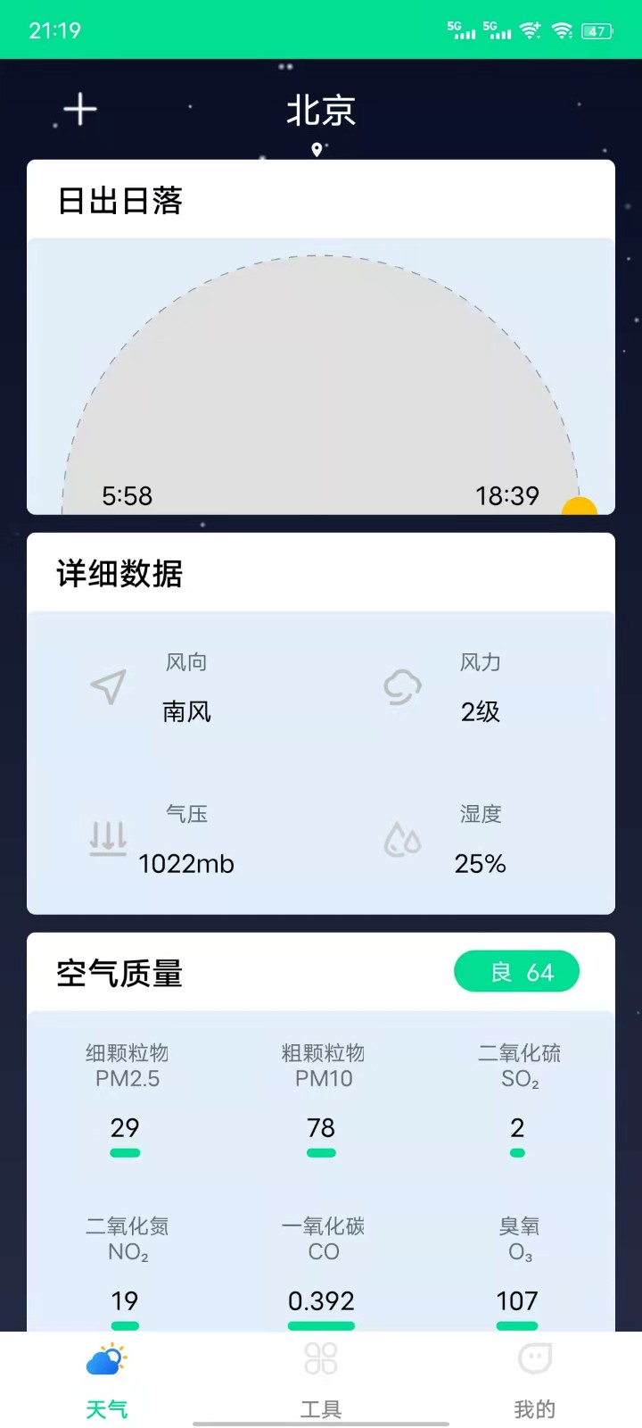 2、实时天气随时查看,还拥有动态背景进行显示,当前温度、湿度以及风向还有空气质量都可以满足您的需求