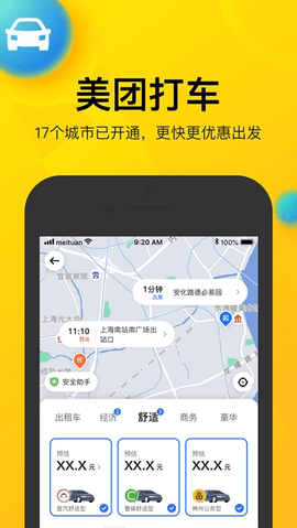 美团提供直达出租车折扣,快速公交车和出租车起步方便